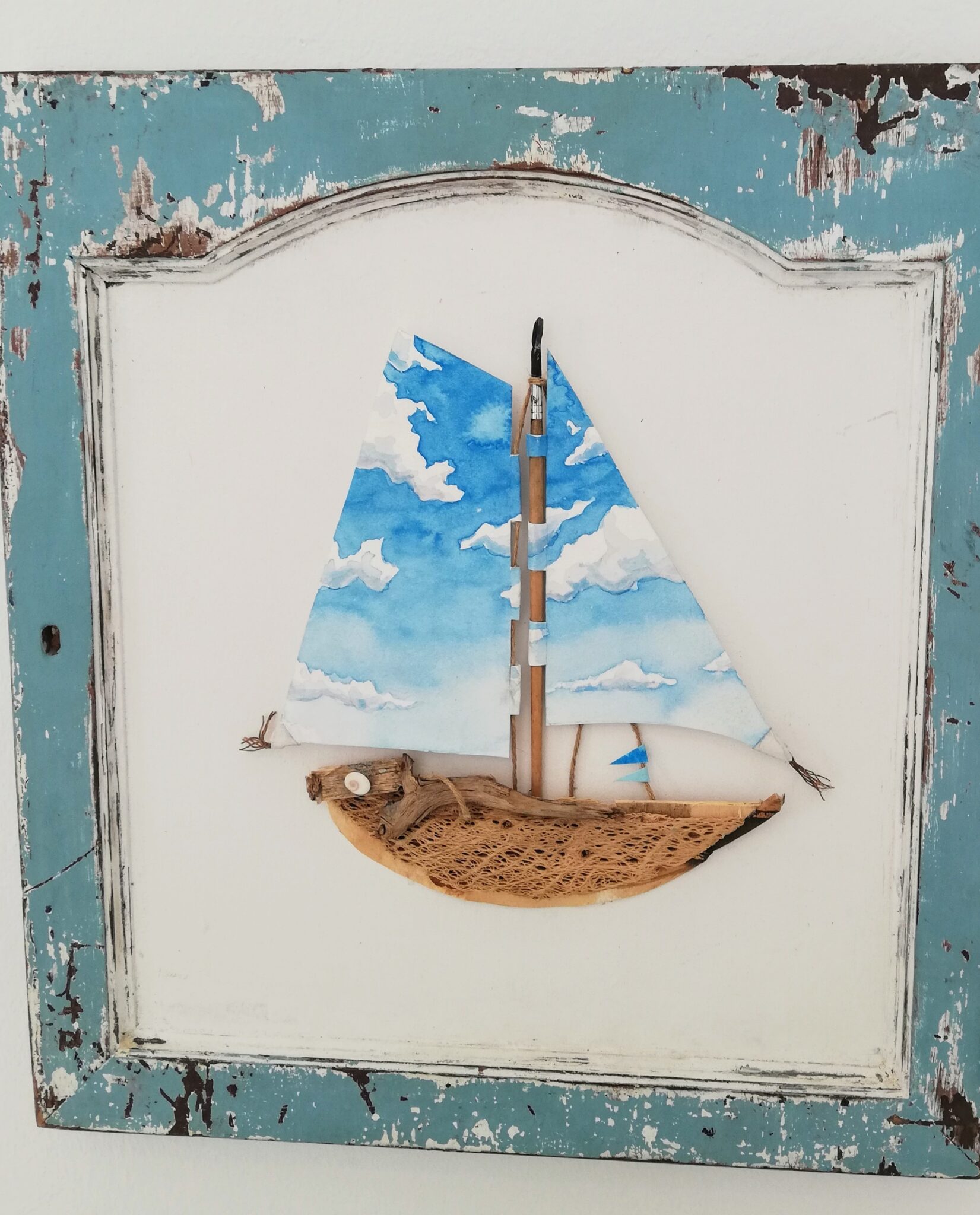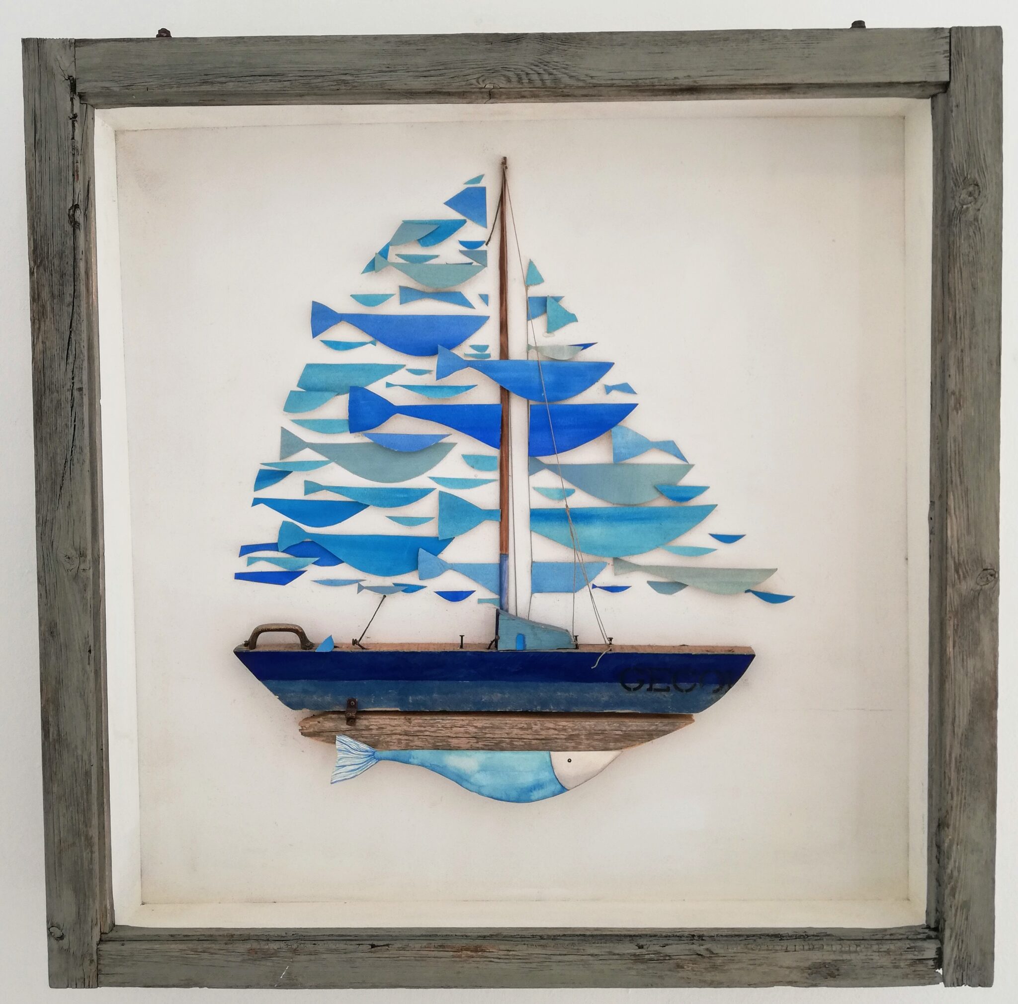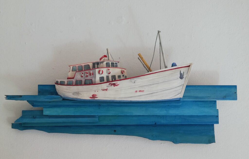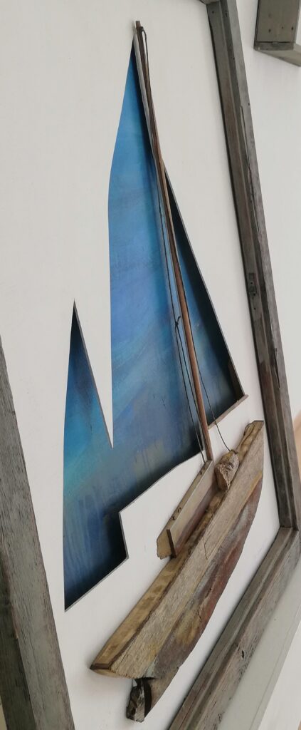 Seitdem hatte Fran Lucas regelmäßig auch Einzelausstellungen. Und diese- 2020- hat eine neue Dimension erreicht. Seine Leidenschaft sind Boote. Aber er sieht sie anders, in sehr interessanten Varianten, so wie sie noch keiner gesehen hat. Auch verarbeitet er in seinen Werken, wie so viele Künstler hier Altmaterial, sogar seine eigenen Reste wie Bilderrahmen, Papier und Pinsel. Das Ergebnis ist ein flash: