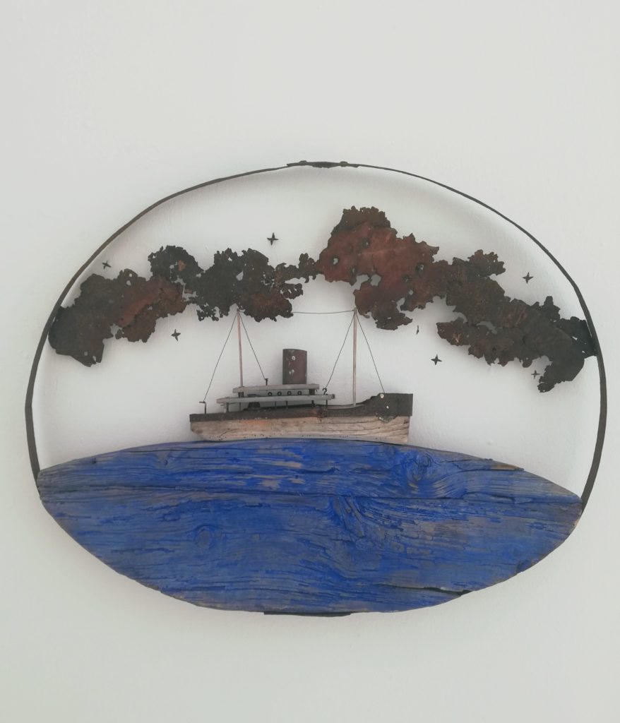 Dieses Dampfschiff ist ein kleines Meisterwerk. Treibholz als Basis, hat sie aus einem angespülten Baumstamm diesen antiken Dampfer kreiert. Die Wolken, oder der „Dampf“ ist oxidiertes Metall eines alten Ölfasses.