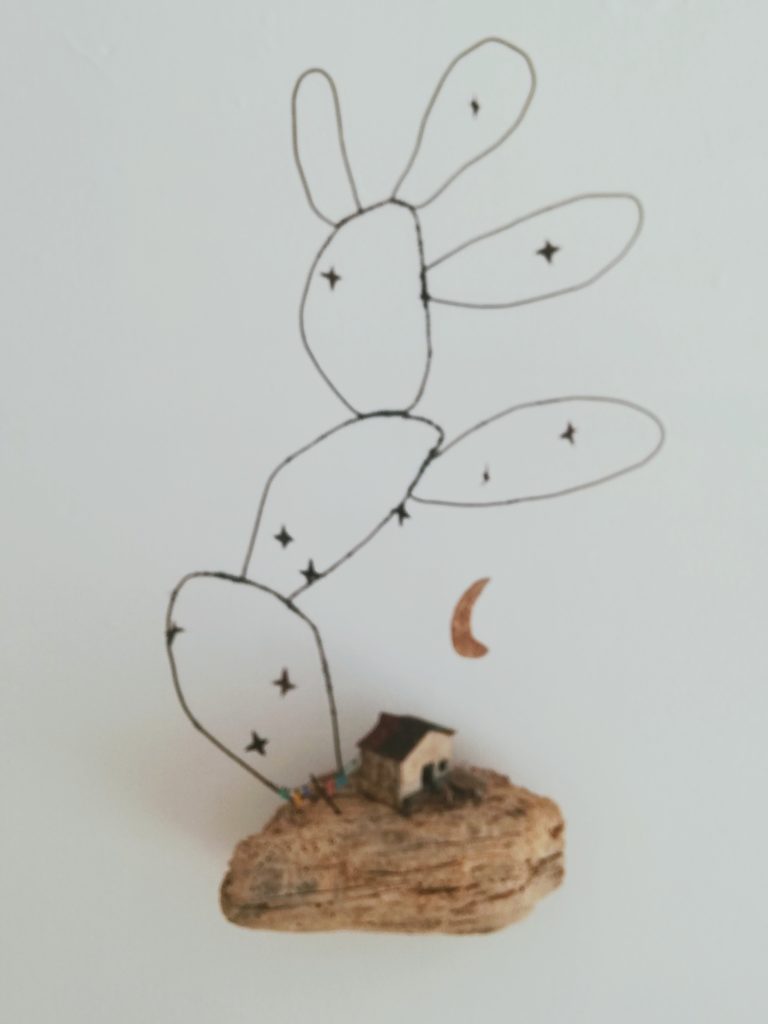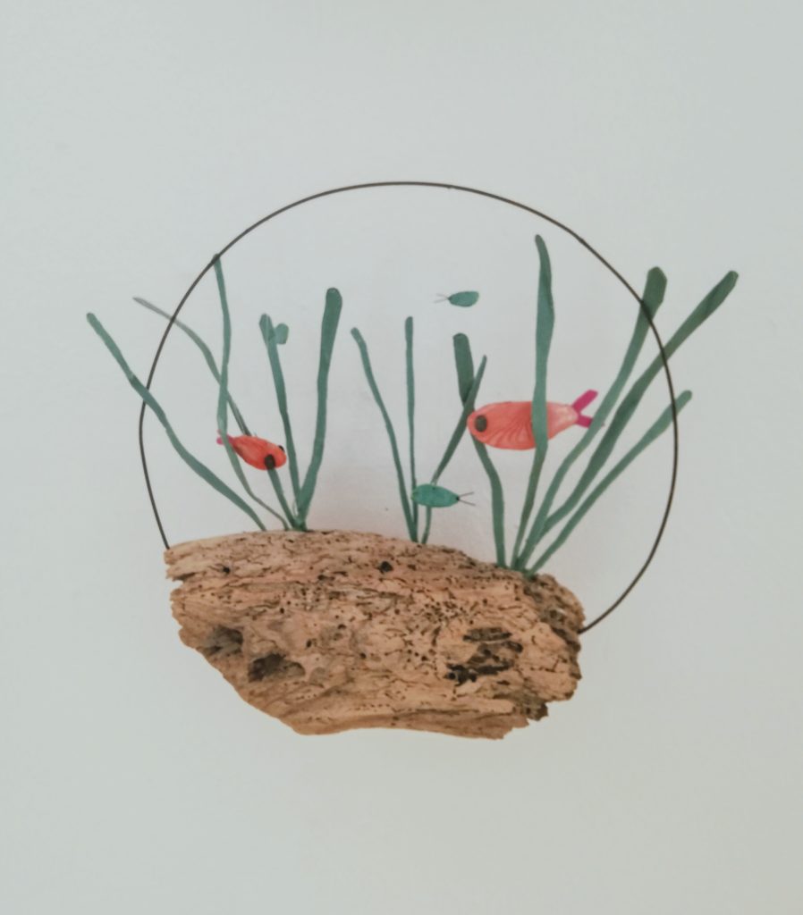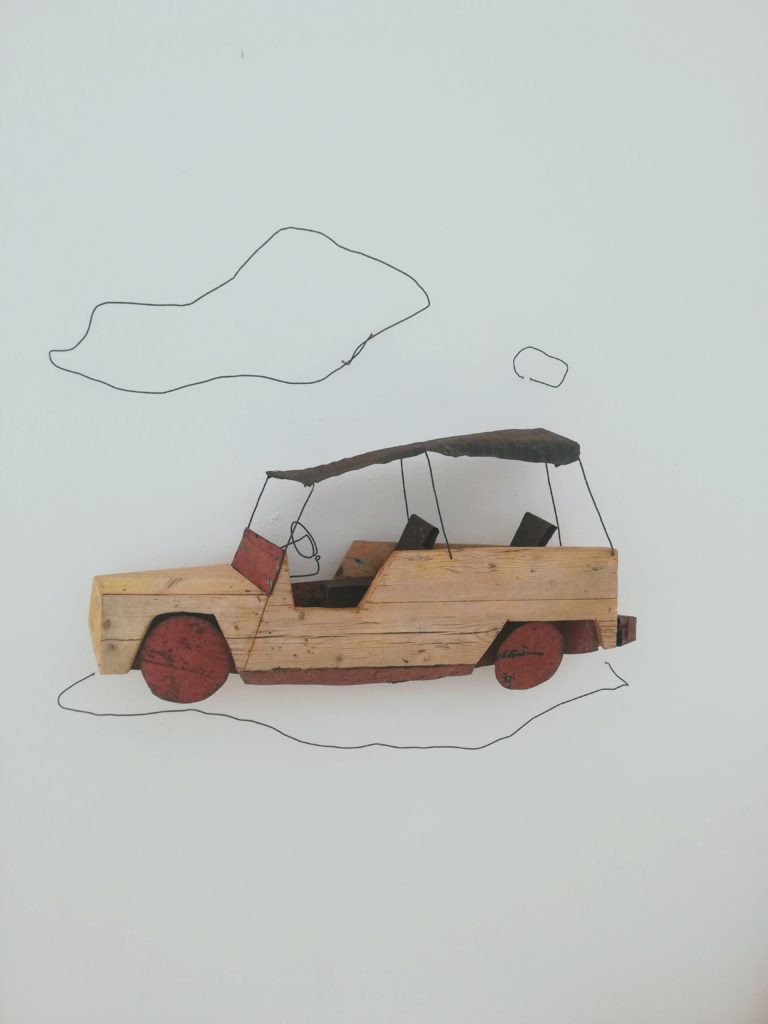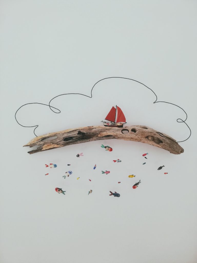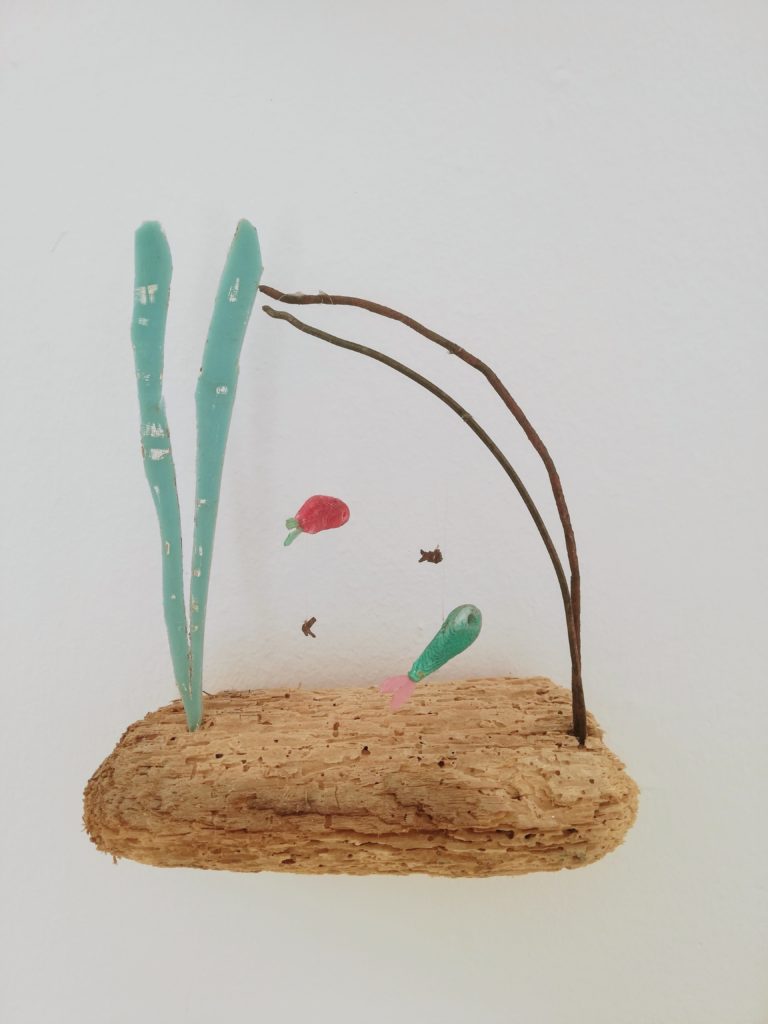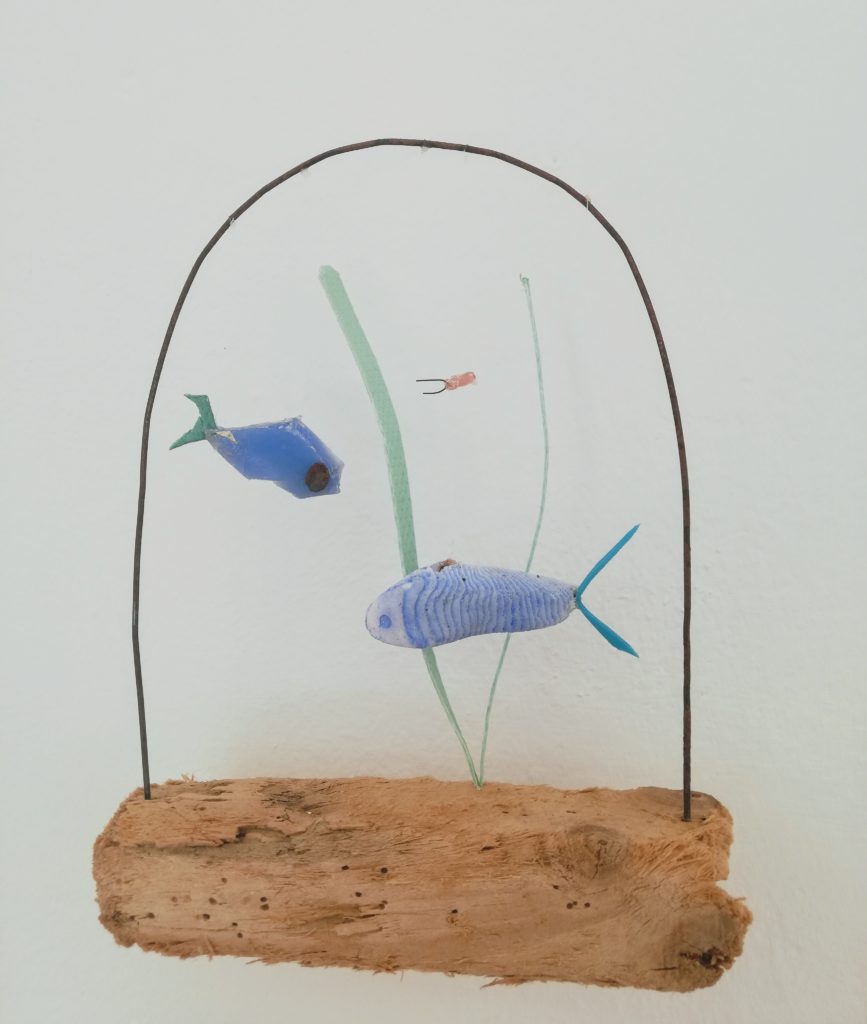 Ametller arbeitet mit dem, was ihre Umwelt auch jetzt im Sommer ist, was das Meer so an Land spült. Denn sie lebt hier auf Formentera auf einem kleinen 6 mtr. Segelboot zwischen Cala Embasté und Es Pujols. Alles, was sie am Strand findet, verarbeitet sie: Holz, Metall, Plastik, also auch recycling. Ihre Motive sind so interessant, weil sie, wie hier auf den Fotos, fast wie Zeichnungen erscheinen, zierlich und leicht. Aber es sind dreidimensionale Skulpturen an der Wand. Alles fast in Miniatur. Die Fische hängen fröhlich an unsichtbaren Fäden und sind oft nur punktgross. Die Objekte sind etwa 20- bis 30cm gross. Die Themen der Künstlerin sind Sommerfrüchte und die Motive aus ihrer Erinnerung und ihrem schlichten, aber sehr interessanten Leben jetzt hier auf der Insel. Ihre Arbeiten scheinen zu Skulpturen gewordene Geschichten.