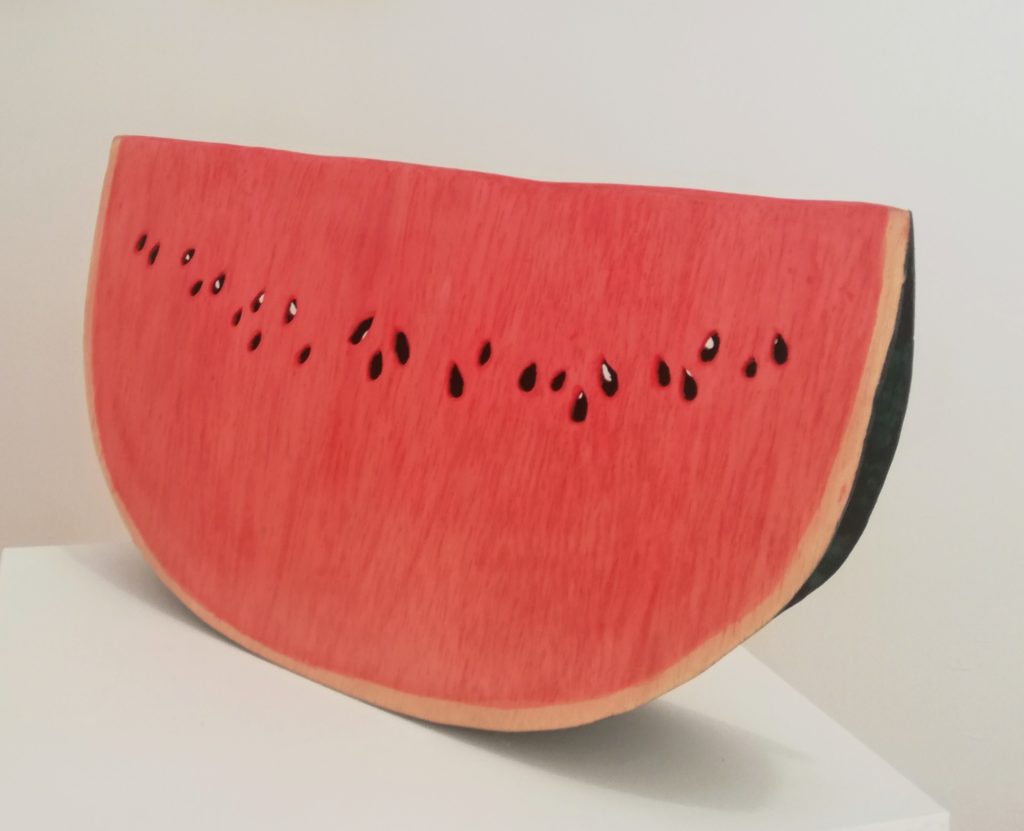 Aber auch Sommerfrüchte: Zitrus-Motive, sowie Melonen inspirieren sie. Es sind bearbeitete Holzblöcke. Die Schale ist in einer Skulptur z.B. aus einem Stück angespültem grünen Gartenschlauches.
