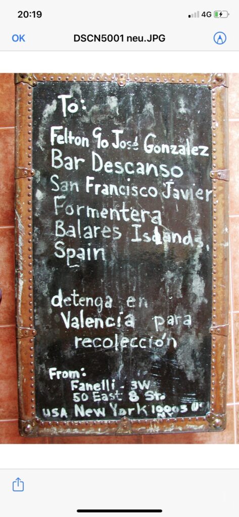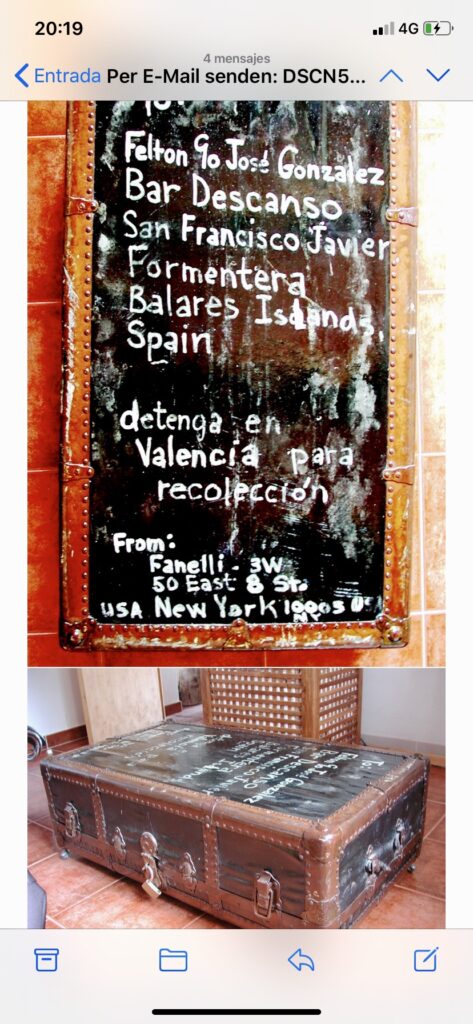Es handelt sich um einen Koffer, den er hier in einer der Mülltonnen gefunden hat. Das Spannende ist, dass dieser eine extrem lange Reise gemacht haben muss, denn der Absender ist eine Person aus New York. Und es war bereits auf der unübersehbaren Adresse angegeben, dass die Route über Valencia gehen sollte, wo dieser Alleinreisende in einer Sammelstelle abgeholt werden sollte. Und der Empfänger ist ein José Gonzalez, Formentera, in der Bar Descanso. Das, was heute das Nobelrestaurant im Sommer für die Italiener ist, nannte sich später Sa Deportiva und wechselte mehrmals den Besitzer. Ángelo hatte schon alles versucht, um das Geheimnis dieses mysteriösen Koffers zu lüften. Und es ist klar, dass es irgendetwas mit dieser Zeit zu tun haben muss. Das Design des Koffer-Modelles von damals und die Form der Reise. Heute wäre es undenkbar, dass ein Reisegepäck allein auf den Weg geschickt werden könnte. Ich finde das eine unglaublich spannende Geschichte und werde alles versuchen, etwas über diesen „Señor González“ herauszubekommen. Selbstverständlich hat mir Ángelo S. nicht nur die Erlaubnis gegeben, sondern mich sogar darum gebeten, ob ich da vielleicht irgendwie weiterhelfen könnte. Denn logisch ist es, dass man über diesen Zeitzeugen etwas mehr erfahren möchte. So habe ich mir den blog vorgestellt. Dass wir gemeinsam irgendwelche Stories und Erlebnisse miteinander teilen und wie hier sogar versuchen Licht in die Vergangenheit Formenteras zu bringen. Danke Ángelo für diesen interessanten Kommentar!