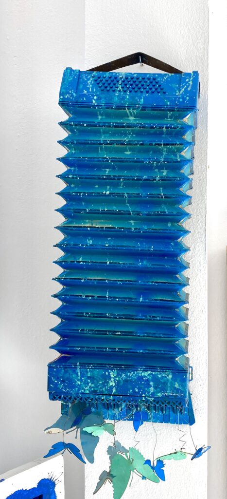 Aber auch Aquarelle in handgearbeiteten Rahmen zieren die Wände und eine Serie von Instrumenten, die sie meist in Deutschland findet und die keine Verwendung mehr haben, verwandelt sie in neue Deko- Objekte.