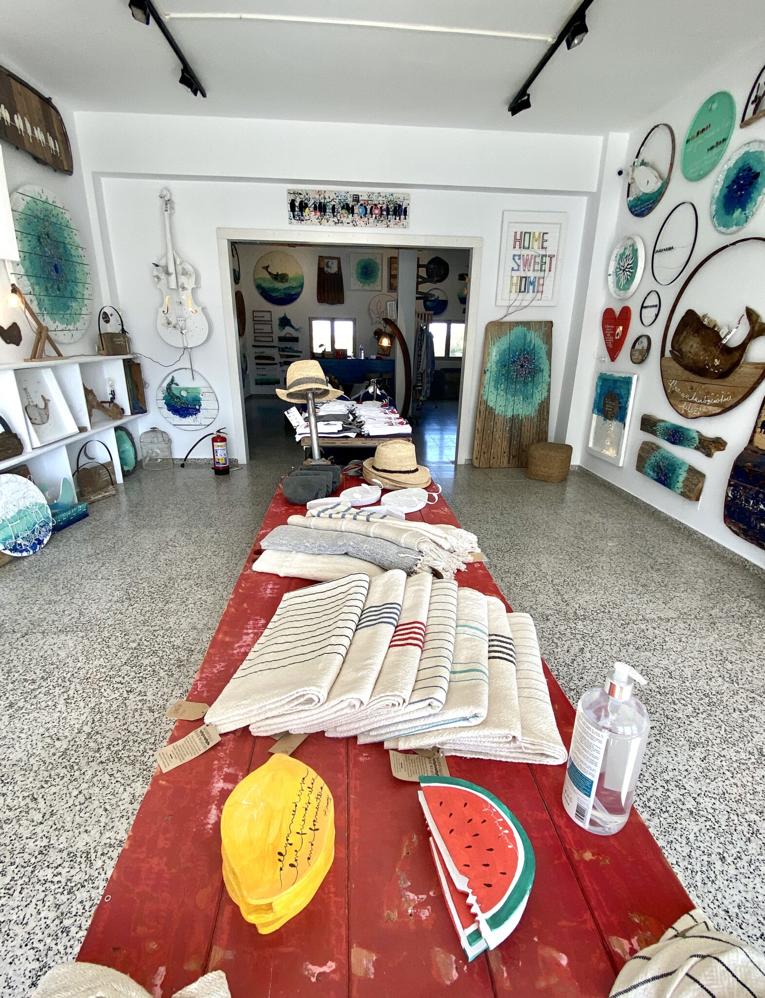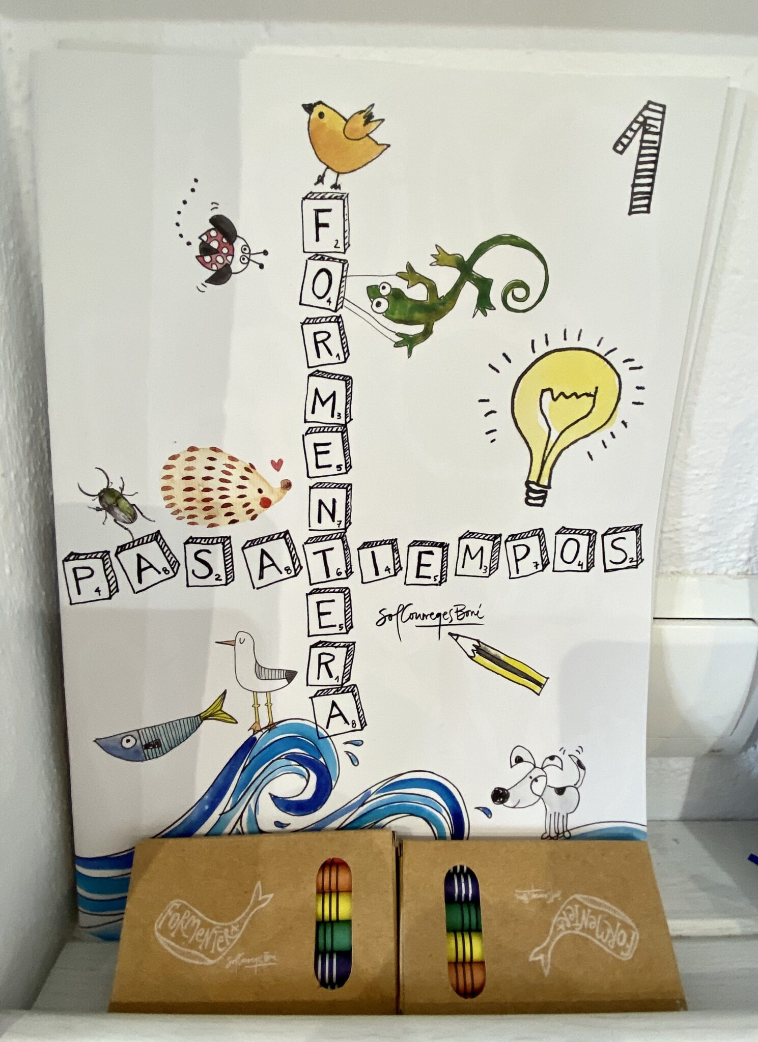 Aber der Fächer hat sich unendlich erweitert. Man findet von den originellsten Stickern über Tragetaschen, Kissen, Notizbücher, oder z.B. Becher aus Bambus,. Alles mit den exclusiven Entwürfen der Künstlerin. Weiterhin sieht man Shellackarbeiten auf Holz, Kabeltrommeln oder bescheiden in ausgedienten Rahmen von Bienenwaben. Die Kollektion ist enorm und für jeden Geldbeutel ist etwas erschwinglich.. Courrèges gibt den alten Sachen neues Leben. Auch an die Kinder ist gedacht. Sie können in pädagogischen Spielen, die die Künstlerin selbst entworfen und gezeichnet hat selbst kreativ werden. Oderin spannenden Büchern etwas über die Meerestiere in den Gewässern von Formentera kennenlernen.