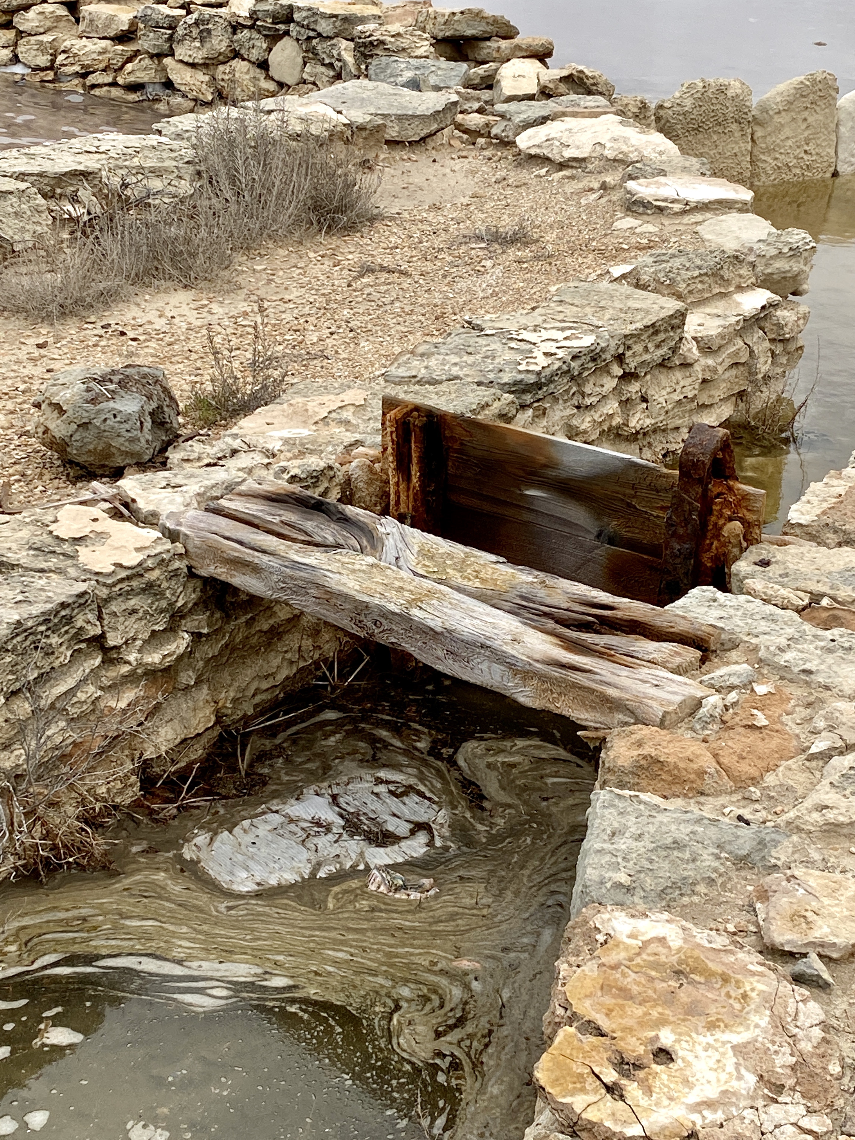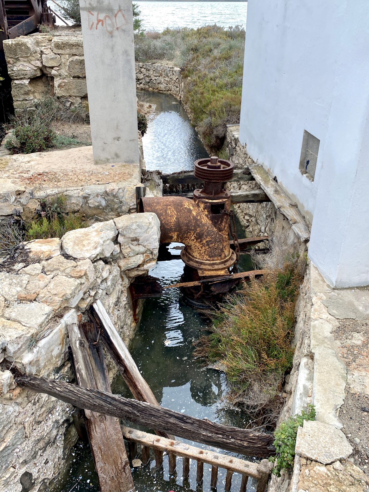 Hier sieht man deutlich die Seitenkanäle , welche zur Wasserzufuhr dienen. Attraktiv, die antiken Brückenzugänge. Um eine außergewöhnlich gute Salzqualität zu bekommen, müssen die Abgrenzungs-Mauern der einzelnen Bassins auch repariert werden, sagte der Chef der Salinen.