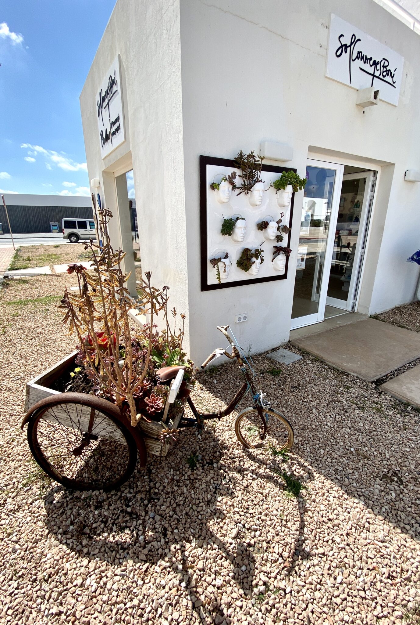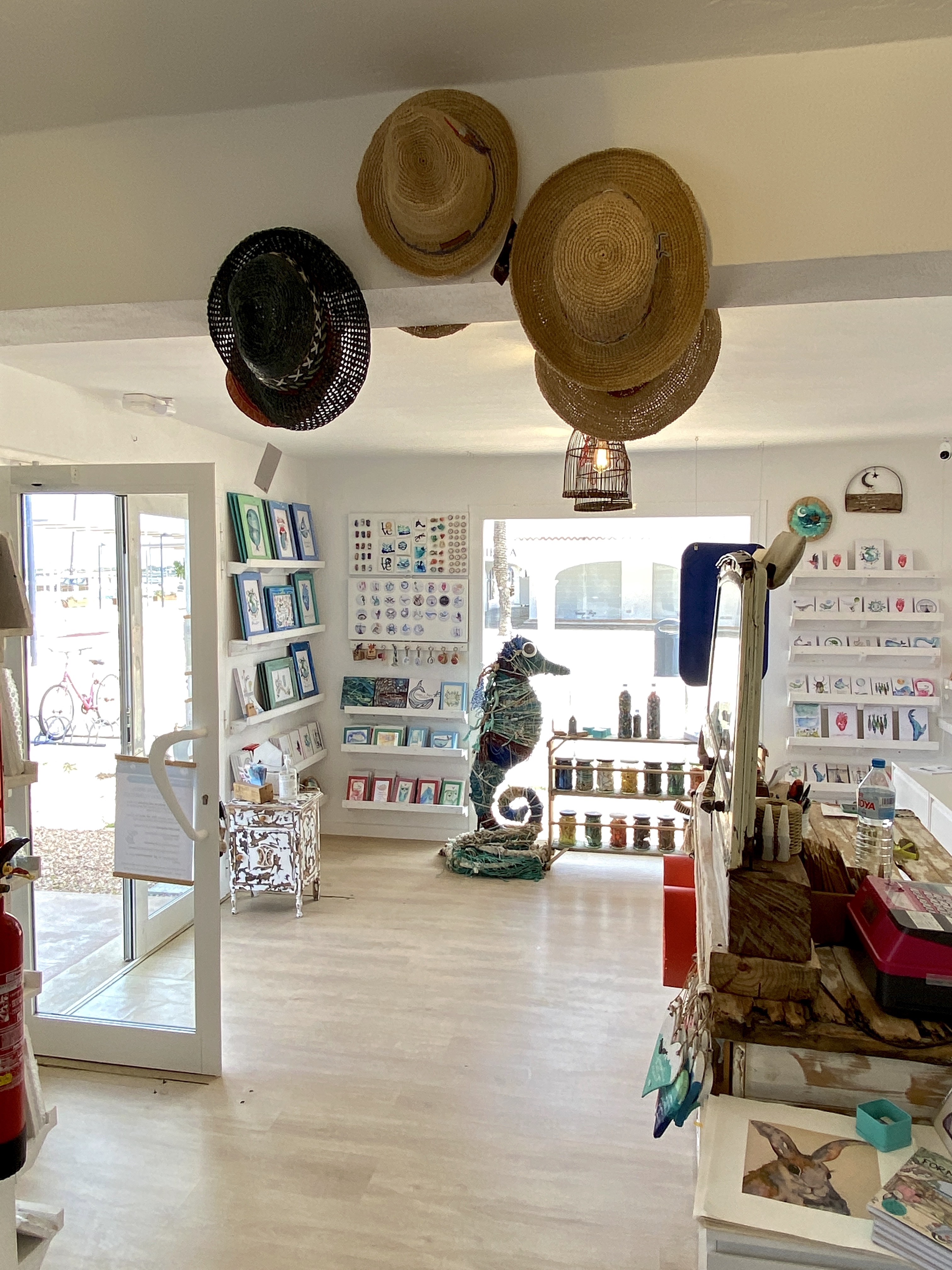 Hier findet man nur kleine Objekte, bis zu 60 cm,. Alles, was in einen Luftkoffer passt. Aber alles ist design Sol Courréges. Und das Tolle ist, es gibt nirgends einen anderen Shop mit dem Siegel „Sol Courreges“, als hier auf Formentera!