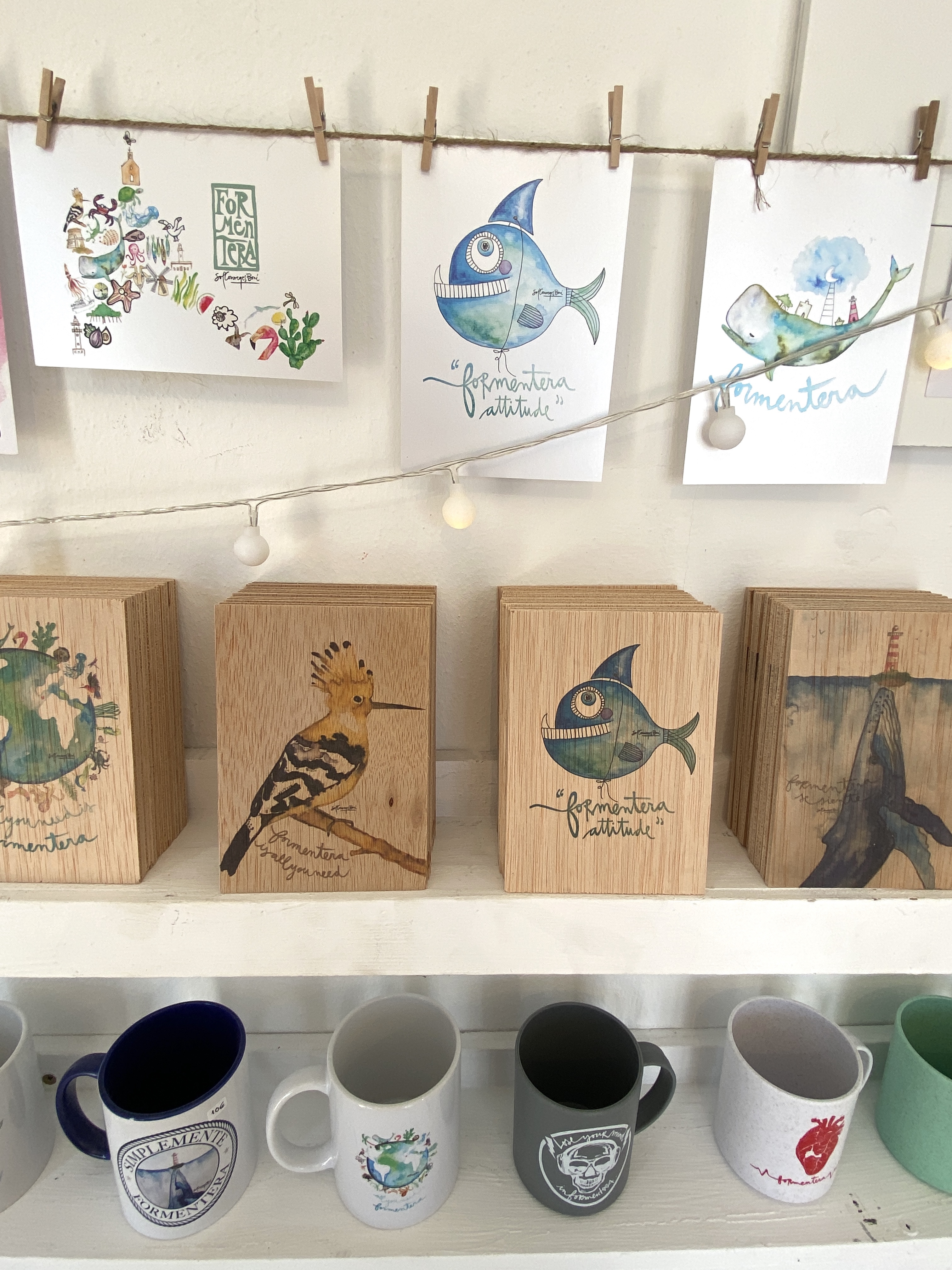 Meine Favoriten sind die originellen Holz- Postkarten. Wo gibt es eine witzigere Idee, als so eine Überraschung aus dem Urlaub, die man sich an die Wand hängen kann? Selbstverständlich mit den Zeichnungen und Aquarellen der Künstlerin! Ihr Konzept ist eine avantgardistische Geschäfts-Idee mit großem sozialen Engagement und einem klaren Kompromiss mit dem Schutz der Insel. Viel Glück, Sol Courréges!